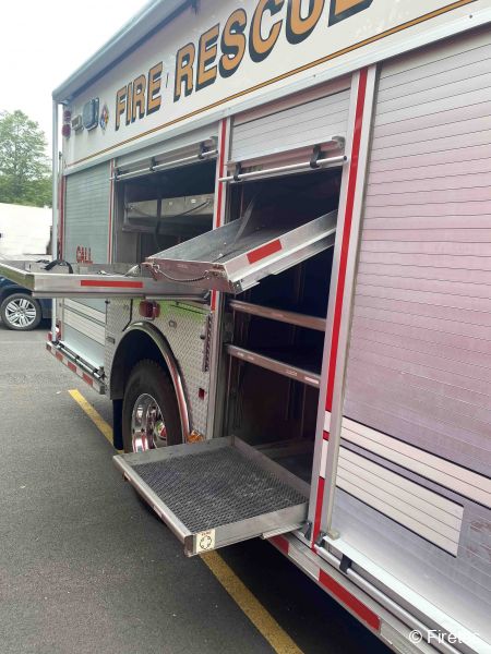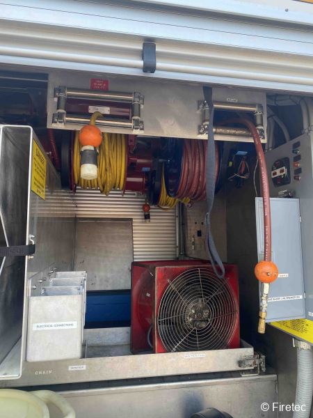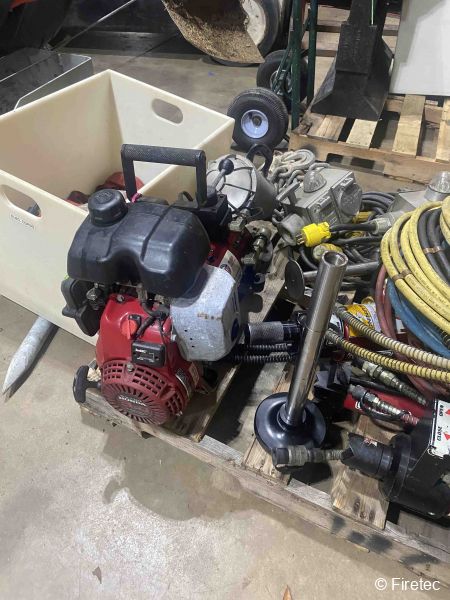 Equipment included in the Sale | 4 SCBA seats, a/c Cascade*, TNT hydraulic rescue tools TLS series. On-board power, 2- 75' high pressure electric rewind hose reels; portable power supply with 2 sets high pressure hoses; 2 sizes of cutters, 1 spreader, 1 ram. PowerHawk elec spreader/cutter/ram tools, 35kw pto-driven generator, ladders, winch, hannay reels (electric & air hose), awning, fans, scene lights, hand lights, hi low UHF radios, emergency lighting, siren |