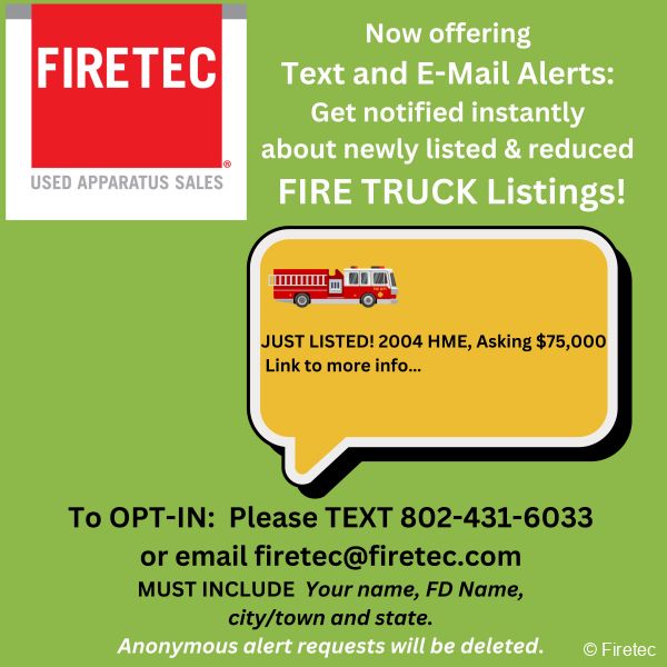 Equipment included in the Sale | Simply TEXT "FIRE TRUCKS" to 802-431-6033. Must include your name, FD name and location. Email notifications for new listings and newly reduced apparatus are also available: sign up by emailing us at firetec@firetec.com |